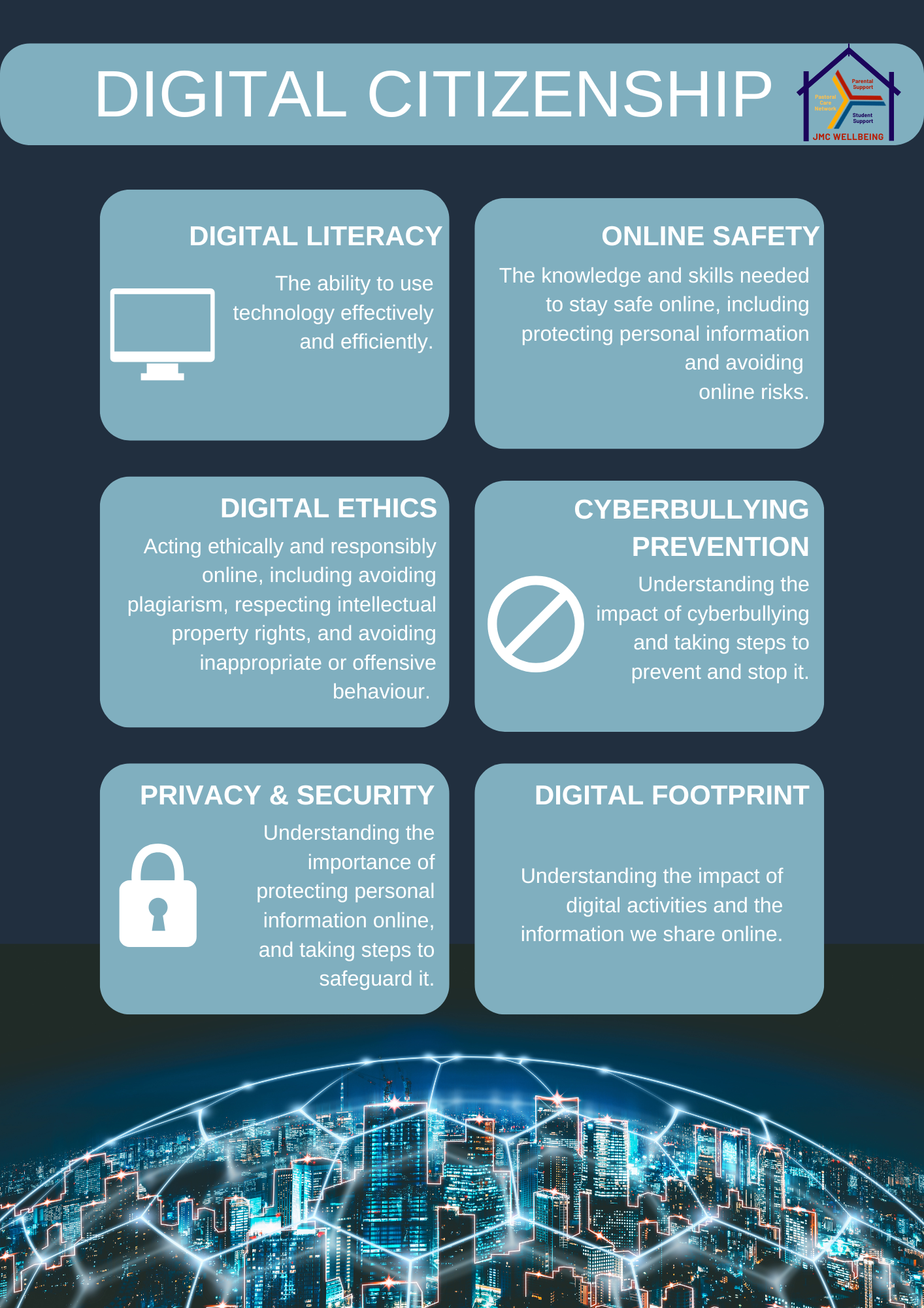 - Personal Responsibility – Respecting others online, avoiding harmful behaviours, and understanding the impact of digital actions.